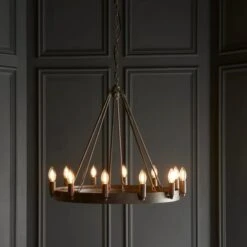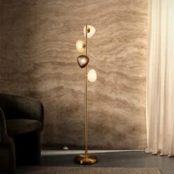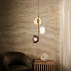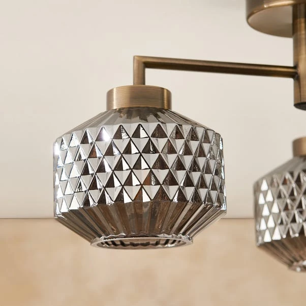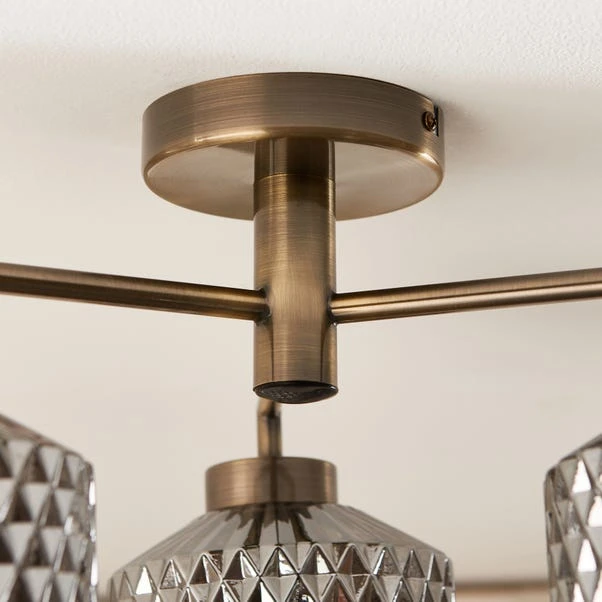 This semi-flush ceiling light combines a sleek design with three smokey, textured glass shades and an antique-brass finish. Perfect for lower ceilings, it offers dimmable functionality when paired with a compatible bulb and switch.