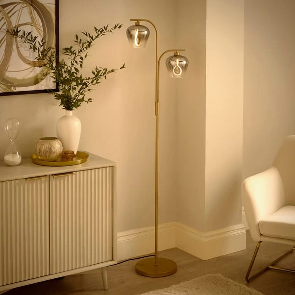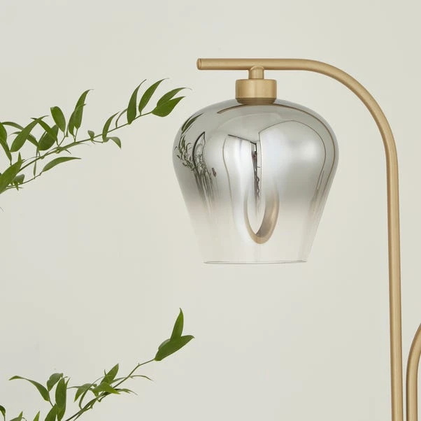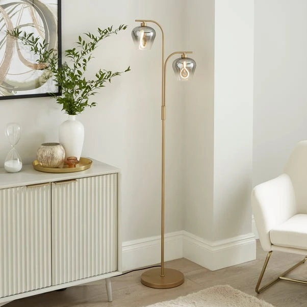 Striking in design, the Aurora 2 Light LED Floor Lamp is the perfect addition to your living space. It boasts a modern ombre, smoked-glass effect, integrated LED lights that emit a warm white glow, and a beautiful gold colourway.