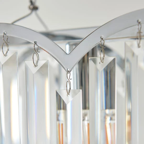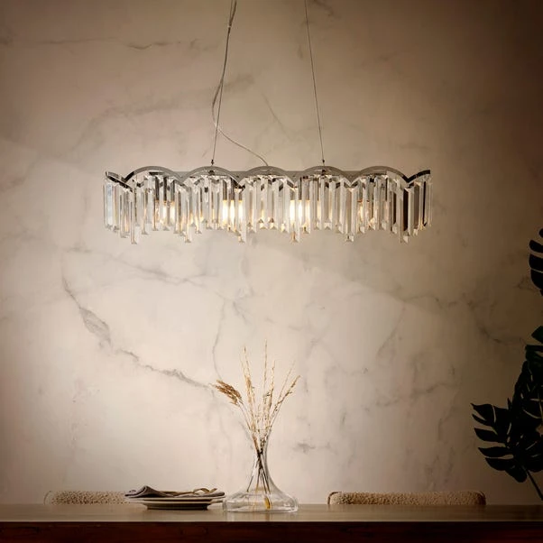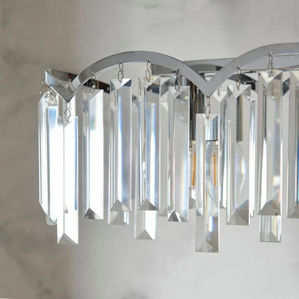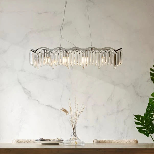 Perfect for placement above a dining table, this ceiling light will make a statement with its crystal-glass composition and luxurious look. With its eye-catching design, it is guaranteed to make a statement.
