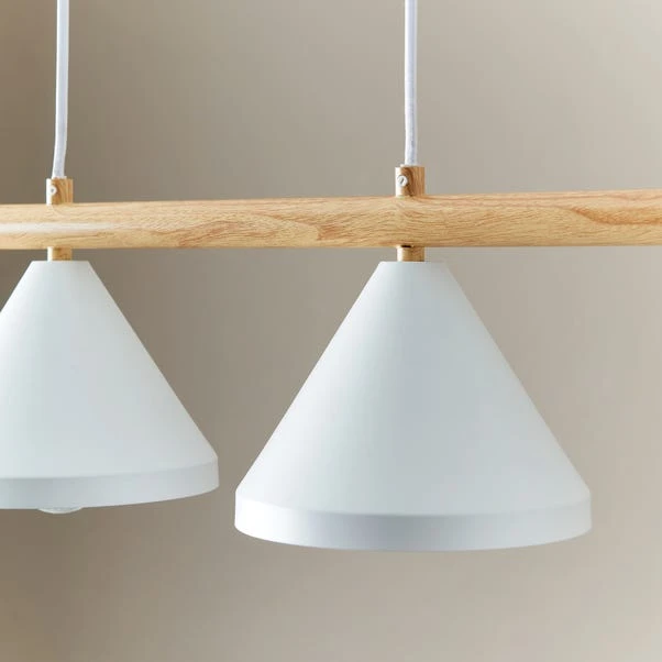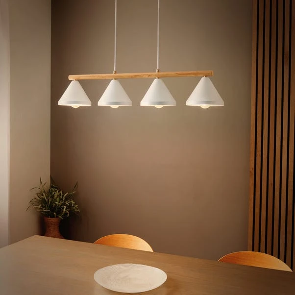 Perfect for making a statement, the Gino Scandi 4 Light Adjustable Diner Ceiling Light boasts white, conical-shaped metal shades beautifully complemented by a wood-effect finish. With its adjustable height allowing for customised ambience, its linear design guarantees beautiful placement above dining tables.