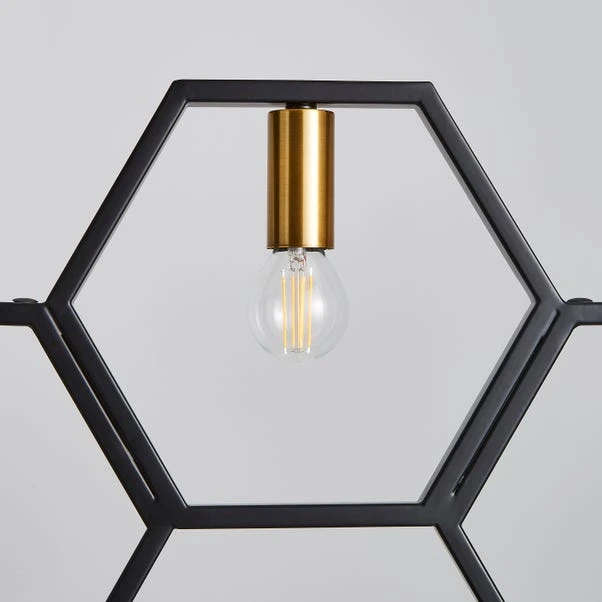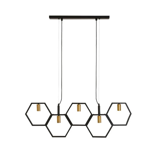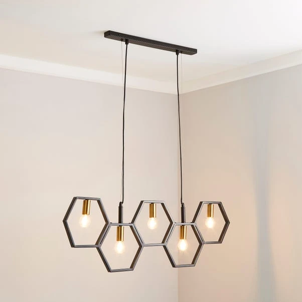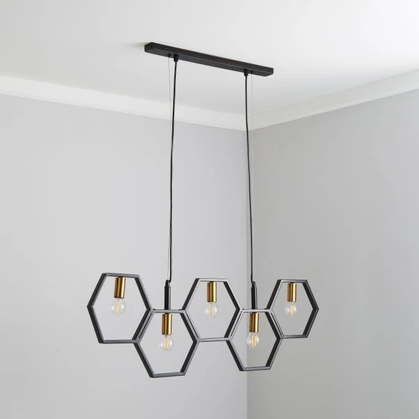 With it’s contemporary geometric honeycomb design, the Hex 5 light ceiling fitting would make a great statement piece and is perfect for bringing a unique style to any modern home. This stunning bar fitting is finished a stunning matt black colourway with contrasting brushed gold finished bulb holders, and boasts a shadeless design making it perfect to display large statement bulbs.
