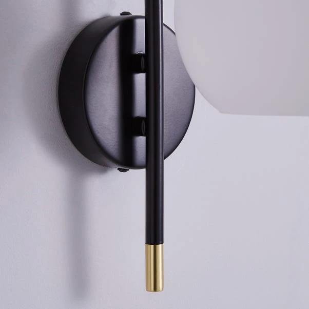 Featuring the modern Joan Wall Light, with a hanging white glass shade and finished in black metal with a Faux leather strap. With its modern colour way, this light will complement an array of home decors. Matching family items available to help coordinate your home.