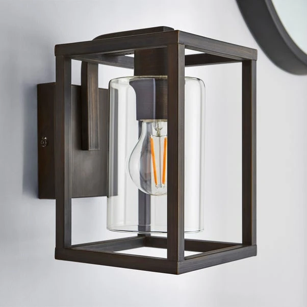 This industrial style wall light is a perfect way to add a contemporary touch to your home, featuring a glass shade and a painted bronze metal frame for a beautiful appearance. Excellent for introducing a rustic element to your living space. This piece is dimmable compatible, making it both an attractive and practical product. This wall light is not suitable for outdoor use.