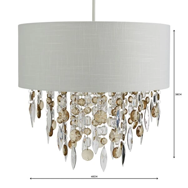 Crafted with an ivory linen-effect fabric shade, this elegant light pendant boasts smoky acrylic crystal droplets hanging from the centre. Easy Fit pendants are ideal for a quick style change without needing an electrician. Simply assemble on to your existing ceiling fitting, and you’re good to go within minutes! Don’t forget to choose the correct bulb for your ceiling fitting.