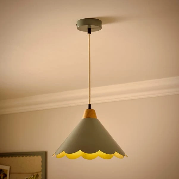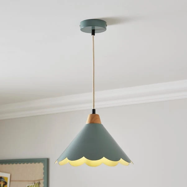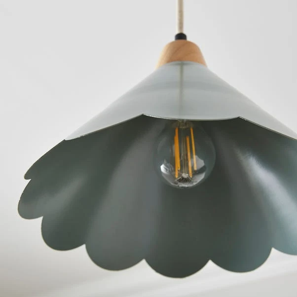 This lovely pendant light features a scalloped edge and a matt finished metal shade with natural wood detailing; it’s the perfect statement piece for any room!