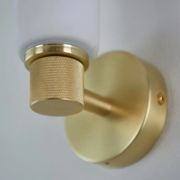 Adorned with a luxurious stainless brushed gold finish, the Roan wall light exudes opulence and style. The textured opal glass shade diffuses a warm and inviting glow, creating a serene atmosphere in your space. Crafted specifically for bathroom use, the Roan Wall Light seamlessly combines practicality with elegance. Designed to be compatible with dimmable bulbs and switches, it allows you to personalise the lighting to suit your preferences. Good things come to those who coordinate, so why not pair this wall light with the matching family items available to purchase separately.