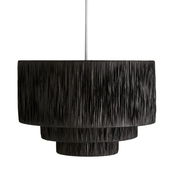 Add a unique touch to your room with the Ruolan Raffia 3 Tier Pendant, featuring a beautiful three tier shade with a twisted design made from Raffia. This pendant is available in a natural & black colourway, perfect for complementing an array of home décor. Easy Fit pendants are ideal for a quick style change without needing an electrician. Simply assemble on to your existing ceiling fitting, and you’re good to go within minutes! Don’t forget to choose the correct bulb for your ceiling fitting.
