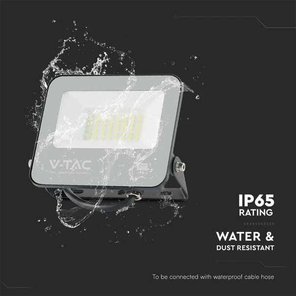 Illuminate your space with the V-TAC 30W LED Floodlight Outdoor Wall Light, designed to deliver exceptional performance with a high lumen efficiency of 135 LM/W. Featuring a high-quality LED SMD-Samsung chip, this floodlight provides bright lighting.