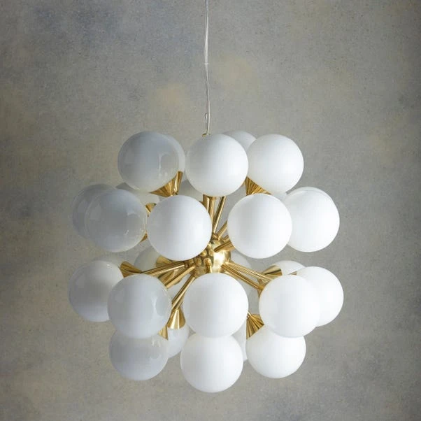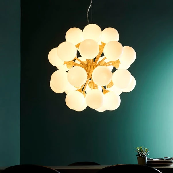 Introducing the epitome of refined elegance, our exquisite 28 Light Pendant seamlessly marries timeless mid-century design with contemporary opulence. The glossy opal glass spheres adds a sophisticated glow, harmonising effortlessly with the lustrous satin brass plated metalwork. Compatible with a dimmer switch, you can set your desired ambience.